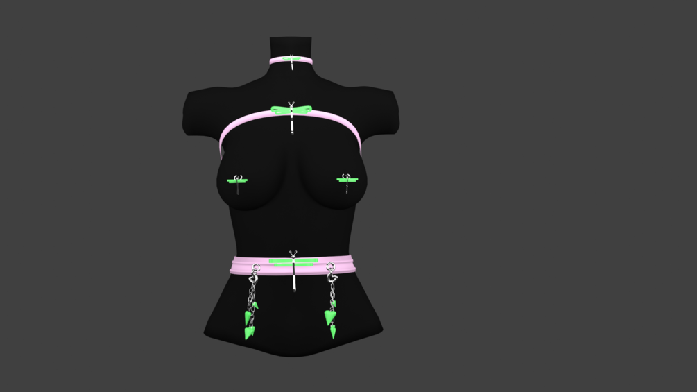 -Choker, Over the boob strap, nip piercings. and around the waist belt